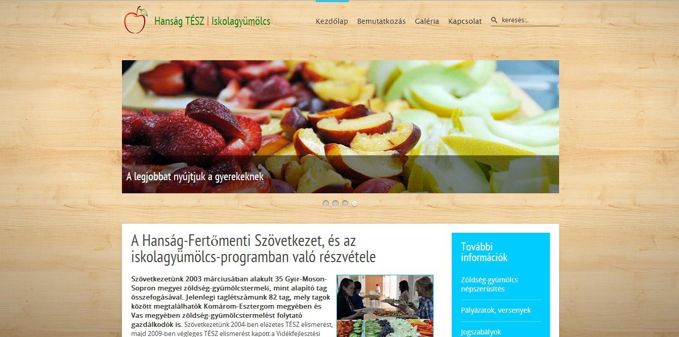A Hanság-Fertőmenti Szövetkezet kiemelt tevékenységi területe az Iskolagyümölcs programon keresztül a kisiskolások iskolagyümölccsel való ellátása. Ezt a tevékenységüket ismeretterjesztéssel, oktatási anyagokkal, pályázatokkal támogatják. Ezért a weboldal érdekes megjelenésével mindezeket a tevékenységeket tükrözi. Szerepelnek rajta a letölthető oktatási anyagok, jogszabályok, valamint az aktuális pályázatok, és többféle stílus és tartalom szerinti galéria.